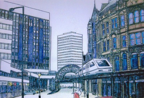 Three years later, Leeds City Council decided to develop its own scheme. Inspired by other schemes overseas (and bearing similarities to the Schwebebahn in Wuppertal, Germany), the proposals included the creation of a network of driverless trains that would convey people above street level. The scheme is largely forgotten and unrecorded, but one image created by consultants Spawforths has survived and has been colourised by Clifford Stead.