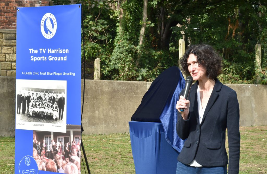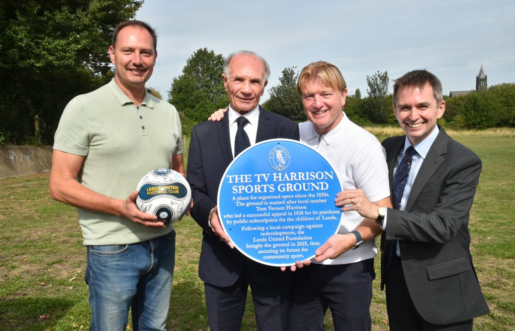 The plaque reads ‘The TV Harrison Sports Ground. A place for organised sport since the 1850s. The ground is named after local teacher Tom Vernon Harrison who led a successful appeal in 1928 for its purchase by public subscription for the children of Leeds. Following a local campaign against redevelopment, the Leeds United Foundation bought the ground in 2025, thus securing its future for community sport.’